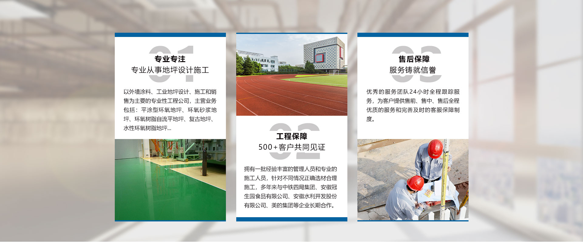 安徽世博裝飾工程有限公司成立于2009年,是一家以外墻涂料、工業(yè)地坪設(shè)計、施工和銷售為主要的專業(yè)性工程公司、是工業(yè)地坪施工的專業(yè)企業(yè)。公司設(shè)立了售后服務(wù)中心,用戶遍布全國大中小城市,一大批具有標(biāo)志性的長期合作伙伴。“世博公司”環(huán)氧地坪工程,受到了越來越多的不同行業(yè)用戶的好評及青睞。公司擁有一批經(jīng)驗豐富的管理人員和專業(yè)的施工人員,以保障產(chǎn)品的成功應(yīng)用,用較小的代價獲得理想的效果,尤其在地坪涂裝方面優(yōu)勢突出。而且以好的品質(zhì)管理模式,向客戶提供“獨具魅力”、“性能優(yōu)異”、“質(zhì)量穩(wěn)定”的產(chǎn)品。公司主要產(chǎn)品包括:平涂型環(huán)氧地坪、環(huán)氧砂漿地坪、環(huán)氧樹脂自流平地坪、滾涂型防靜電地坪、自流平防靜電地坪、復(fù)古地坪、水性環(huán)氧樹脂地坪、彩色透水混凝土地坪、壓花壓模藝術(shù)地坪、金剛砂耐磨硬化地坪、混凝土密封固化劑地坪、乙烯基酯重防腐地坪、GEP 標(biāo)準(zhǔn)型地坪、彈性PU運動場地坪、塑膠跑道地坪,PVC橡膠地板、停車場地坪、無震...